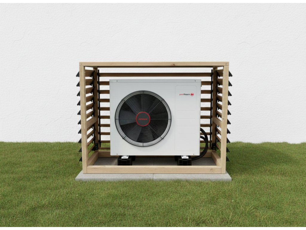 Ideální řešení pro zakrytí venkovní jednotky tepelného čerpadla. Další výhodou tohoto řešení je snížení hluku jednotky.
